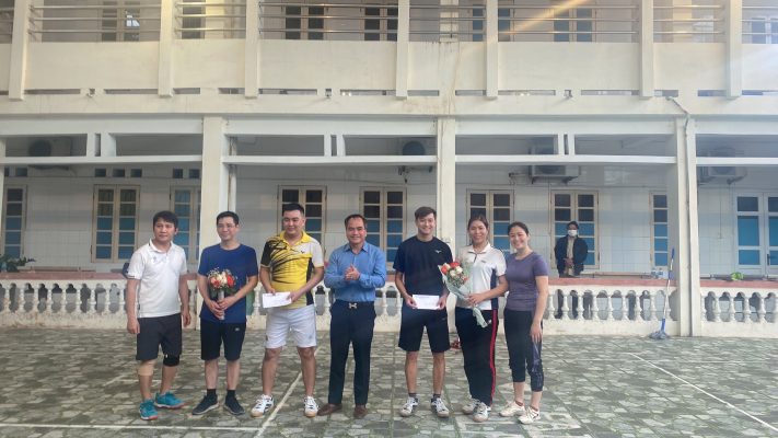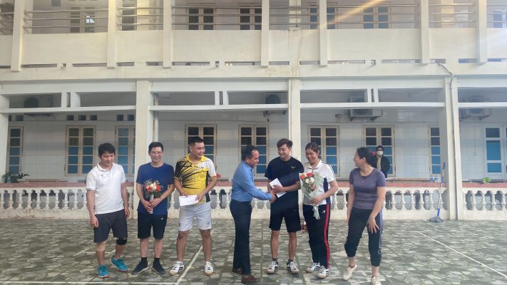 Lãnh đạo Trung tâm Y tế thành phố Hải Dương tặng quà cho các đội đạt giải cầu lông đôi nam và đôi nam nữ .