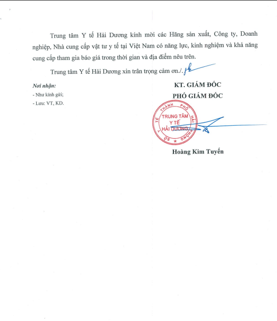 Trung tâm Y tế Hải Dương kính mời các Hãng sản xuất, Công ty, Doanh nghiệp, Nhà cung cấp vật tư y tế tại Việt Nam có năng lực, kinh nghiệm và khả năng cung cấp tham gia báo giá trong thời gian và địa điểm nêu trên.
